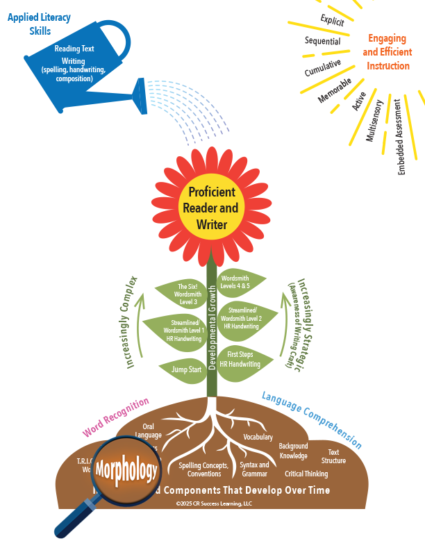 CRSL was a pioneer in incorporating morphological awareness (MA) instruction in its programs. MA is an important component of First Steps, Streamlined Levels 1 and 2, The Six!, and Wordsmith Levels 1-5. Wordsmith Levels 4 and 5 concentrate on morphology.