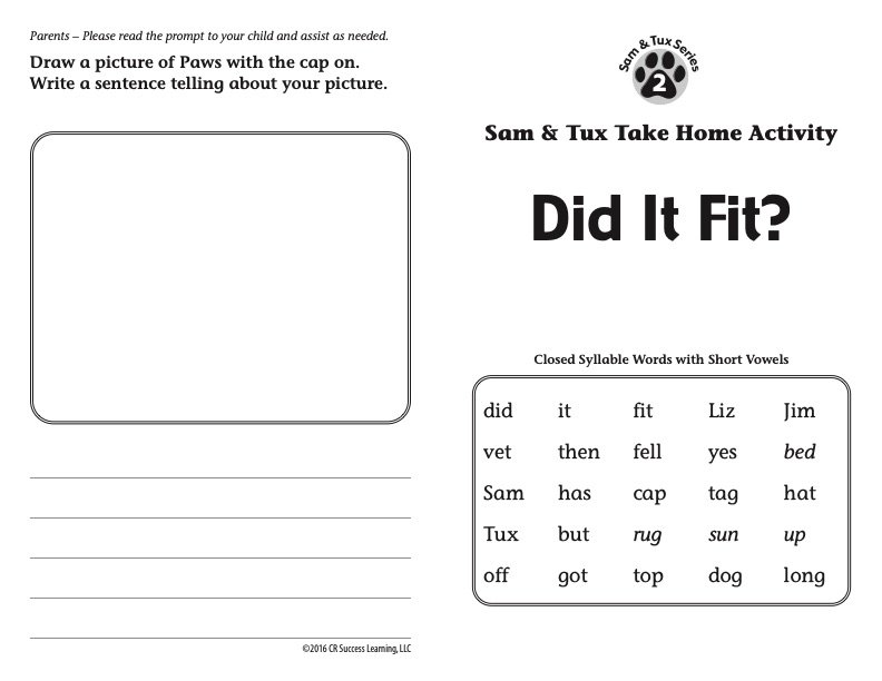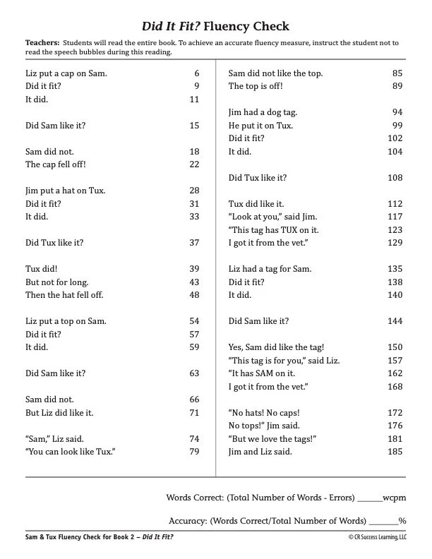 Progress Sam and Tux Teacher Guide Complete & Continue Next Lesson Learn More Teacher Guide: Sam and Tux 9 Lessons Readme Book 1: The Pet's Nap Book 2: Did It Fit? Book 3: Tux Did Too Book 4: A Day with Sam Book 5: Tux's Big Heart Book 6: No, No, Sam Book 7: Stop It! Book 8: Best Pets Sam and Tux Teacher Guide Complete & Continue Next Lesson Learn More Teacher Guide: Sam and Tux Book 2: Did It Fit?